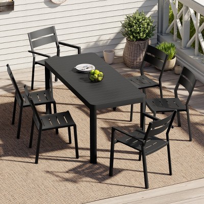 Upgrade your outdoor dining experience into an enjoyment that combines modern industrial aesthetics with ultimate comfort. The centerpiece of this set is the sleek, all-aluminum outdoor dining table finished in black powder coating. Its sturdy, low-maintenance construction and spacious surface make it the perfect platform for hosting guests, while the central 1.7-inch umbrella hole allows you to easily pair it with your favorite outdoor umbrella, creating a cool and shaded atmosphere for gatherings. Paired with the aluminum dining chairs, which feature supportive high backs with armrests and are wrapped in durable, weather-resistant Sunbrella Textilene fabric, all-day comfort is assured. Their unique 360-degree swivel and gentle rocking functions turn every seat into a dynamic and relaxing experience. Together, this table and chair set, with its minimalist modern style and user-friendly comfort design, creates an outdoor dining space that blends style with relaxation. Warm Tip: Products may be shipped separately and arrive at different times. Please be aware and wait patiently to ensure you receive your complete order. Dimensions are in the product picture. Customer Service: If you have any pre-sales or after-sales inquiries, you can contact us by calling our official customer service hotline at 833-4231-158 (Mon-Fri, 11:00AM to 8:00PM EST) or emailing us at target@peteroutdoor.com.