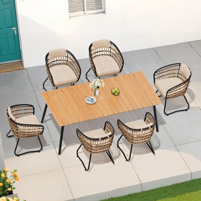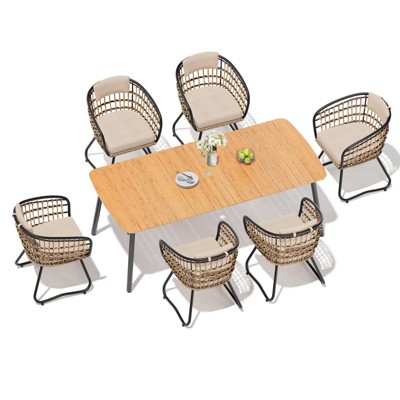 Transform your patio into the ultimate entertaining space with this complete Expandable Aluminum Dining Set, designed to comfortably host gatherings of up to 6. The durable, rustproof aluminum table features a versatile extendable design to adapt to any occasion, while the accompanying PE rattan wicker chairs with plush seat cushions provide lasting comfort and style. Together, they create a perfect balance of robust functionality and relaxed elegance for every outdoor meal. Dimensions are in the product picture. Customer Service: If you have any pre-sales or after-sales inquiries, you can contact us by calling our official customer service hotline at 833-4231-158 (Mon-Fri, 11:00AM to 8:00PM EST) or emailing us at target@peteroutdoor.com.