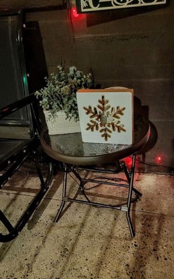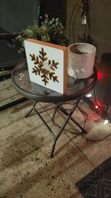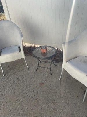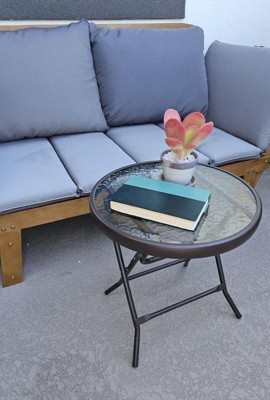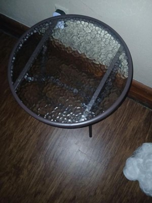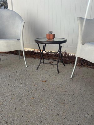 [This review was collected as part of a promotion.] This side table is the perfect size for my balcony seating area. The table arrives assembled and folded so set up was a breeze. The tempered glass top is really pretty as well as thick and durable. The legs are strong and sturdy. I love that it folds up easily to store when not in use.
