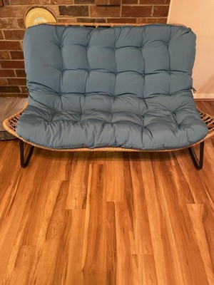 This Crestlive Large All Weather Rattan Patio Loveseat in Blue Is Gorgeous. It is made heavy duty but yet easily moved from space to space. The cushion is very thick and soft, comfortable to sit on. This is a great piece of furniture very durable and high-quality loveseat to relax on my patio deck. . As of now i have it inside to allow for extra sitting until spring and the weather is nicer outside. The assembly was fairly easy to put together although one person can put it together some parts it does take two to hold the parts together. I love the bamboo backing and on the seat area .