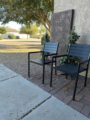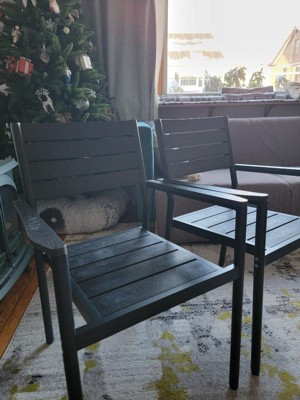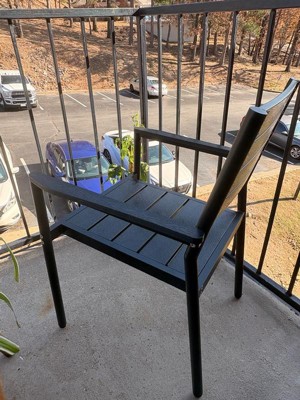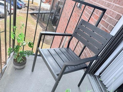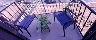[This review was collected as part of a promotion.] These aluminum outdoor chairs are great for small spaces. They are sturdy and durable while still being easy to assemble. I love that they are stackable as well to make room when needed.