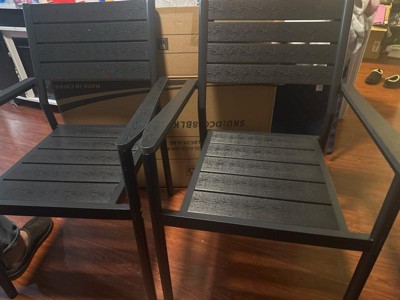 [This review was collected as part of a promotion.] These outdoor chairs were easy to build and only took about 20mins. They have a wood grain pattern on them but they are not wood which is good for outdoors. They feel very sturdy and well made. I wish the bolts that are seen on the chair were black instead of silver so it would have a seamless look but that’s not a dealbreaker. I’m only 5’4” and when I sit all the way back on these chairs my feet don’t touch the floor completely, tippy toes. So when I eventually buy cushions for these chairs, which is suggested since they are hard chairs and not comfortable without cushions; I will be even higher up. I like that the chairs have arms and are wide enough for extra room. Can’t wait until the spring/summer to use them outside because right now it’s winter and snowing lol.