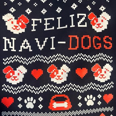 • Festive Dog Design for the Holidays: Features a playful Feliz Navi-Dogs print with red and white dog graphics, bones, paw prints, and trees; eye-catching pattern brings cheer to any ugly sweater party or Christmas celebration