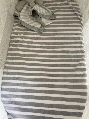- Skirt and changing pad cover feature gray and white geometric patterns