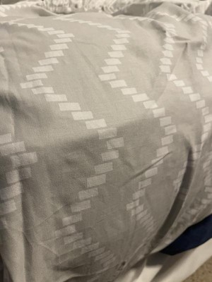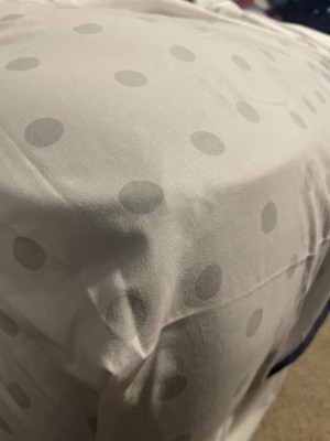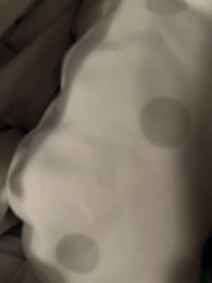 A: One sheet has gray polka dots on white, and the other has white chevron stripes on gray.