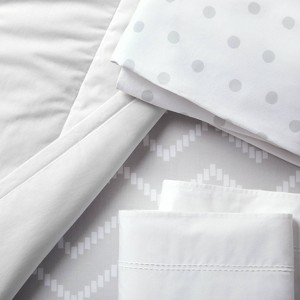 This 4-Piece Crib Bedding Set from cloud island™ is suitable for standard cribs and toddler beds. This bedding set includes two crib sheets, with gray polka dots on a white background on one and stylized chevron stripes in white against a gray backdrop on the other. Also included are a channel-stitched quilt in light gray and a white crib bedskirt with a 14-inch drop length. All pieces are made of 100% cotton and are machine washable for added convenience.