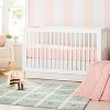 This 4-Piece Crib Bedding Set from Cloud Island™ is suitable for standard cribs and toddler beds. This bedding set includes two peach crib sheets, with unicorn prints on one and white crescent moon and star prints on the other. Also included are a channel-stitched quilt in peach adorned with decorative-stitched designs of stars and a crescent moon and a crisp white crib bedskirt with a 14-inch drop length. All pieces are made of 100% cotton and are machine washable for easy cleaning.