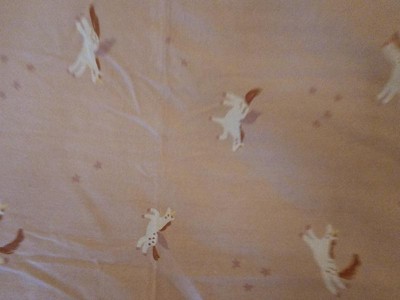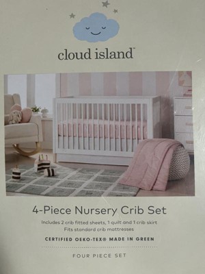 This Cloud Island bedding set is beautifully package, perfect for gift giving or just buying for your upcoming baby girl. This is a 4-piece set which includes a solid medium pink quilt with half moon and stars on it, 2 crib sheets of different designs (unicorns) and a white skirt for the crib. It is a useful and beautiful set and everything is machine washable.