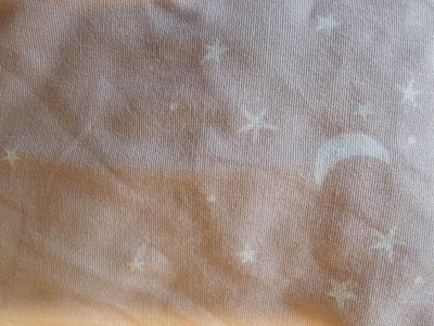 A beautiful pink color. I love this bedsing set. It comes with 2 fitted sheets. One has tiny stars and moons design and the other one has cute little unicorns. The quilt has a moon and stars design pattern.