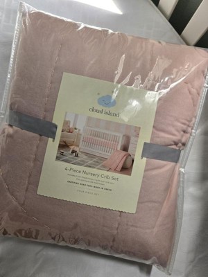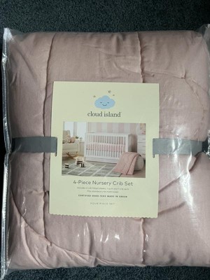 This four piece crib set is perfect. It contains two sets of sheets, one with unicorns the other with stars and moons. Also has a crib skirt and an oversized comforter. The color is a dusty pink It has beautiful stitching on both the skirt and the comforter. The skirt was a bit large for the crib I have, but it can be pinned To fit. The color is perfect. It is not too loud and not too bland. It would go nicely in any nursery.