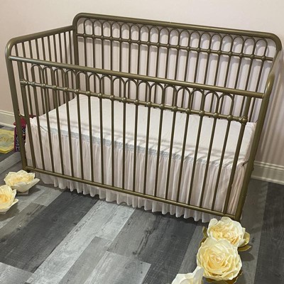 This crib skirt is adorable, but does slide. It was the only skirt I could find that matched our princess nursery decor, so it’s fantastic visually, but I’ll probably at some point add some elastic ties to it to hold it in place as it somehow shifts forward constantly.