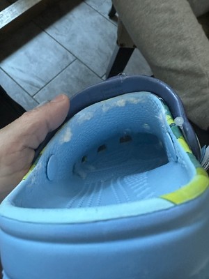 Bought these Crocs for my daughter. They came with remnants of glue and fuzzy inside. There are scratches and discoloration from where a possible fuzzy liner was (poorly) removed. Very disappointed in Crocs for sending this out to a customer without a second thought. Poor way of doing business.