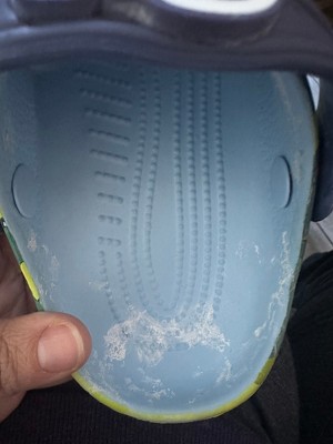 It appears that there was a fuzzy liner inside that was removed causing damage to both shoes. The fuzz and glue is still inside them along with scratches from possible force used to remove it. Not the quality you would expect for a full price shoe from Crocs. Terrible! Very disappointing. The description doesn’t mention anything about this defect.