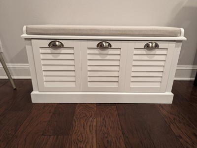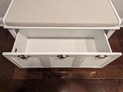 [This review was collected as part of a promotion.] Very attractive, quality entryway storage bench. Bench has a large drawer for all the things you need in your entryway. We added dividers into the drawer so we can organize hats, mittens, shoes, jackets...depending on the season. It has a beautiful smooth white finish. The design is simple, drawer is louvered, it complements any decor. Also, it comes with a nice comfy cushion for seating. It does require assembly...we found it to be moderately simple, a little tricky at times. Personally, I am not a fan of the shell cup hardware it came with it for the drawer and I changed them. It looks absolutely beautiful in my entryway, such a nice quality piece of furniture. Has a nice clean coastal vibe.