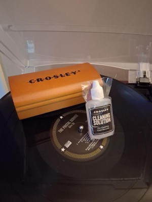 Even the most pampered vinyl can attract dust and fingerprints. Spoil your vinyl collection by keeping it clean and its music sharp with the exclusive Crosley cleaning solution. To use, simply place record on turntable and start rotation. While the turntable is spinning, place a few drops along one edge of the brush and gently place the wet edge perpendicular to the grooves and let rotate several times until clean. Allow to dry completely before playing.