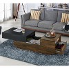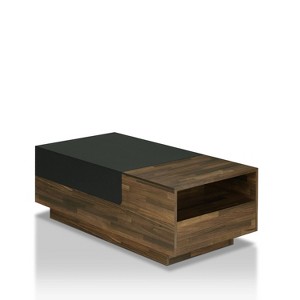 If you like the minimal look but need storage space, this is the coffee table for you. The table design offers multi-storage with open shelf, drawer, and its unique pull-out storage. A functionality that is useful to extend reach for snacks and beverages! This table function is not the only thing to offer. The two-tone wood and blacktop draw the eyes to it, making it the perfect centerpiece in your living room.
