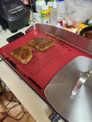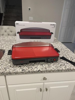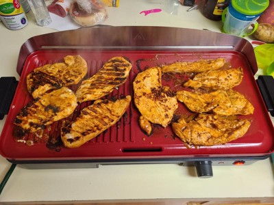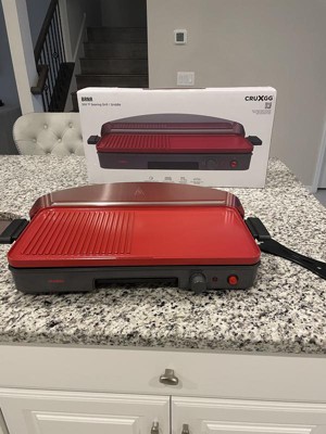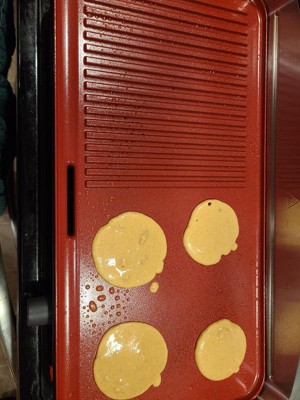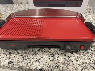 I was so excited to try this griddle. Once I took it out of the box, I was impressed by how sleek and beautiful it looked. I really liked the red color and the size was perfect for my countertop. I read the manual and decided to cook up some steaks. One side is flat and the other has ridges for cooking thicker cuts of meat. The temperature gets really hot and it seared my steaks perfectly. It was also really easy to clean. I look forward to cooking more foods on it.