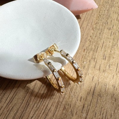 A pair of crystal baguette embedded hoops with the perfect amount of sparkle. A versatile piece that's easily dresses up or down. Gorgeous worn solo or mixed alongside your favorite studs and hoops. 19mm tall.