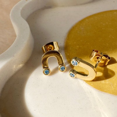 Tiny, arc studs dotted with two tiny blue crystals. Wear these sparking studs solo or alongside your favorite studs and hoops. Measures 8mm x 8mm, 2mm thick.