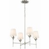 The Broche 4 Light Chandelier embodies a harmonious blend of traditional and modern elements. This fixture exudes timeless elegance with its candelabra-style frame and white linen shades. The layered wrought iron leaves create a stunning and functional display of light. Whether in a bedroom, living area, or kitchen, this chandelier adds a touch of refined glamour to any space, making it perfect for transitional and modern designs. Broche collection features a versatile transitional design. / A balanced blend of traditional and contemporary elements, featuring clean lines, neutral finishes, and subtle detailing, offering versatile designs that complement a variety of interiors. / Shipped with Shades included. / Antique Silver metal finish is a mid-tone gray with lavender and blue undertones. This finish will add intensity to the overall look of an interior and perfect for farmhouse and rustic settings. / 28"W x 28"H x 28"D / 4 light 60- watt, E12 Candelabra base / Steel + Fabric / Auth