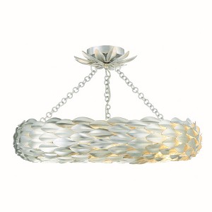 Layers of individual wrought iron leaves deliver a stunning, unique, and functional light. The tailored elegance of the shimmering metallic florals is perfect for a transitional home though versatile enough to be incorporated into any modern design. While ideal for a bedroom, living area, or kitchen, it can be used anywhere you want to add a bit of glam. Broche collection features a versatile transitional design. / A balanced blend of traditional and contemporary elements, featuring clean lines, neutral finishes, and subtle detailing, offering versatile designs that complement a variety of interiors. / Convertible, can be installed as a ceiling mount or chandelier. The fixture offers a ton of light that will illuminate your ceiling. / Antique Silver metal finish is a mid-tone gray with lavender and blue undertones. This finish will add intensity to the overall look of an interior and perfect for farmhouse and rustic settings. / 24"W x 5"H x 24"D / 6 light 60- watt, E12 Candelabra base