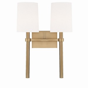 One of our most versatile designs, the Bromley wall mount with a oversized white shade can be used in any room of the home. Designed with thoughtful simplicity, the Bromley strikes the perfect balance of function and form. Bromley collection features a versatile modern / contemporary design. / A balanced blend of traditional and contemporary elements, featuring clean lines, neutral finishes, and subtle detailing, offering versatile designs that complement a variety of interiors. / White silk shade included. / The Vibrant Gold metal finish has a softer gold color. This finish adds sophistication to any space and pairs elegantly with traditional, transitional, and contemporary d�cor. / 13.75"W x 18.5"H x 7.25"D / 2 light 60- watt, E12 Candelabra base / Steel + Fabric / Authorized for use in damp, high-humidity interior locations or protected exterior locations. Meets United States UL Underwriters Laboratories Product Safety Standards / Thoughtfully simple wall sconce complete with a met