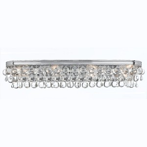 Elegance and glamour will illuminate the room with the Calypso collection. Draped in an abundance of smoothed shaped clear drops and balls, this contemporary collection is a perfect statement to a living room, dining room, bathroom, or entry. Calypso collection features a versatile modern / contemporary design. / A sleek, sophisticated style blending clean lines, neutral tones, and layered textures, focused on simplicity, functionality, and understated elegance. / Modern glass wall mount. / The Vibrant Gold metal finish has a softer gold color. This finish adds sophistication to any space and pairs elegantly with traditional, transitional, and contemporary d�cor. / 33"W x 6"H x 6"D / 8 light 60- watt, E12 Candelabra base / Steel + Glass / Authorized for use in damp, high-humidity interior locations or protected exterior locations. Meets United States UL Underwriters Laboratories Product Safety Standards / The modern Calypso is a best selling series with sizes from 7" to 40" making thi