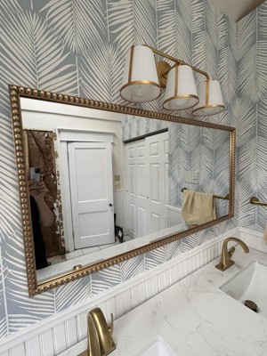 This antique gold tone light fixture looks perfect in our new bathroom. It is a very nice quality. We were very happy with the quality and it was easy to install ourselves.