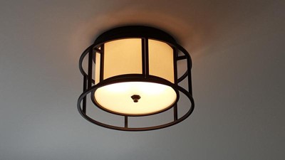 Such a visually cool ceiling light. Well made and worth the money. Quick shipping, too. (Two 60 watt lightbulbs light a 12×12 room with just enough light. Use two 75 watt lightbulbs if you like a brighter room.)