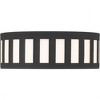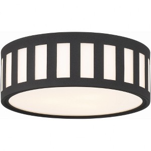The contemporary Kendal collection makes a statement with its graphic uniform pattern. Its metal frame surrounds white glass in this elegant drum-shaped ceiling mount. The high contrast of Vibrant Gold, Black Forged, or Polished Nickel against white glass is a great way to add a touch of drama to a room. Kendal collection features a versatile modern / contemporary design. / A balanced blend of traditional and contemporary elements, featuring clean lines, neutral finishes, and subtle detailing, offering versatile designs that complement a variety of interiors. / The rectangle cutouts in the Kendal feature the illuminated white glass. / Black Forged metal finish is a deep black finish with a surface texture. This finish is ideal for industrial, rustic, farmhouse, and transitional decor settings. / 14"W x 5"H x 14"D / 3 light 60- watt, E26 Medium base / Steel / Authorized for use in damp, high-humidity interior locations or protected exterior locations. Meets United States UL Underwriter