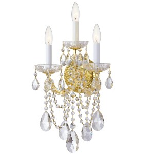 Draped in an abundance of crystal, the Maria Theresa collection is the epitome of high style. The fixture is stunning with glass arm frame decked with strands of faceted cut crystal. The fixture showcases opulence and decadence and is the perfect traditional accent to any space. Whether in a living room, or even closet or hallway, this fixture bring a luxurious addition to any decor. Maria Theresa collection features a versatile traditional design. / Timeless designs with intricate metalwork, curved arms, crystal embellishments, and classic finishes, bringing a sense of warmth and heritage to any space. / The glass paneled arms of the Maria Theresa collection is a true nod to the classics. / Gold metal finish, perfect for traditional settings. / 11"W x 22.5"H x 8"D / 3 light 60- watt, E12 Candelabra base / Glass / Authorized for use in damp, high-humidity interior locations or protected exterior locations. Meets United States UL Underwriters Laboratories Product Safety Standards / Thi