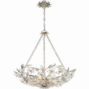 The Marselle Collection is adorned with hand-cut crystal jewels and wrought iron leaves designed in a playful arrangement. The detail of leaves and intricate floral designs lend a sense of organic artistry to each piece, creating a mesmerizing display of nature's splendor. Available in three sophisticated finishes�white, gold and silver, this collection offers a touch of opulence for every decor. The crystal jewels are cleverly connected to form delicate flowers, adding a touch of whimsy and charm to your space. Even the canopy features a leafy design, completing the harmonious blend of nature and art. Marselle collection features a versatile transitional design. / A breezy, light-filled style that blends soft hues, natural materials, and nautical touches for a relaxed, seaside-inspired feel. / Dual mountable chandelier or semi-flush adorned by connected crystral jewels to form beautiful flora motifs. / Antique Silver metal finish is a mid-tone gray with lavender and blue undertones.