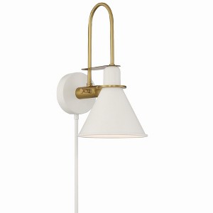 The functional and fashionable Medford task light is versatile enough to fit into any interior. Stylish, modern and minimal, the fixture features a two-toned tapered metal shade and round backplate, powered by a dimmable switch to adjust brightness and can be hardwired or plugged into your outlet. Medford collection features a versatile transitional design. / Characterized by clean lines, sculptural forms, and warm metallic or wood accents, often featuring bold shapes and playful pops of color for a retro yet timeless appeal. / Powered by a dimmable switch to adjust desired brightness. Hardwire or plug into your outlet (8 feet electrical cord; Two 12in Metal cord.). / White metal finish, perfect for transitional settings. / 7"W x 14"H x 10"D / 1 light 60- watt, E26 Medium base / Iron / Authorized for use in damp, high-humidity interior locations or protected exterior locations. Meets United States UL Underwriters Laboratories Product Safety Standards / The Medford collection features