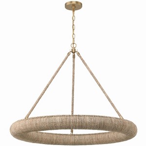 Elevate your space with the Oakley ring chandelier, an artisan masterpiece that blends natural charm with exquisite craftsmanship. With its open-top design, this chandelier infuses a room with a soothing and relaxed ambiance, directing light upward while casting a soft, filtered glow downward. Crafted from natural Lake Grass in a warm, neutral tone, this fixture showcases intricate hand-wrapped details that add depth and character, reflecting the essence of skilled artisans. With dual mounting options, it effortlessly adapts to any space. Oakley collection features a versatile farmhouse / rustic design. / A breezy, light-filled style that blends soft hues, natural materials, and nautical touches for a relaxed, seaside-inspired feel. / Integrated dimmable 30W LED panel. CCT selectable to a rated color temp of 2700K or 3000K. 3500 lumens and a CRI 90 rating. / Soft Gold metal tones showcase a light and airy feel that work well with transitional settings. / 32"W x 3.5"H x 32"D / 1 light
