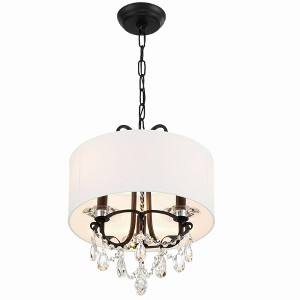 Classic like a timeless piece of jewelry, the Othello dazzles with traditional glamour. This elegant fixture is decorated with swags of faceted cut crystal jewels optimally cut for awe-inspiring sparkle and surrounded by a white silk drum shade to create a diffused lighting experience. These fixtures add the perfect bit of glam to any room and are sure to catch the eye and the light. Othello collection features a versatile transitional design. / Timeless designs with intricate metalwork, curved arms, crystal embellishments, and classic finishes, bringing a sense of warmth and heritage to any space. / The updated modern take on a crystal collection, the Othello collection is sleek and contemporary. / Matte Black finishes are everywhere in contemporary design. This velvety muted finish makes a modern statement and can create a beautiful contrast while maintaining a super stylish and sleek look. / 14"W x 17"H x 14"D / 3 light 60- watt, E12 Candelabra base / Steel + Fabric / Authorized fo