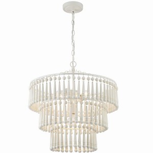 The Tiana collection blends coastal charm and contemporary elegance. This chandelier exudes a serene and relaxed vibe that is perfect for infusing your space with a touch of beach-inspired tranquility. It features multi-sized white beads that create a delightful visual texture, adding depth and character to the design. The interplay of the beads casts a warm and inviting glow when illuminated, creating an enchanting ambiance in any room. Tiana collection features a versatile farmhouse / rustic design. / A breezy, light-filled style that blends soft hues, natural materials, and nautical touches for a relaxed, seaside-inspired feel. / The wooden accents of the Tiana collection help define the overall shape. / Matte white metal finish pairs well with any d�cor style. The velvety, non-glossy sheen offers a dramatic contrast to a room. / 20.5"W x 21"H x 20.5"D / 3 light 60- watt, E26 Medium base / Steel / Authorized for use in damp, high-humidity interior locations or protected exterior lo