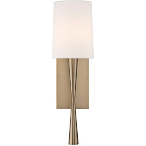 Add a touch of class to your office or living room wall with this Trenton wall sconce. The appealing curves of its slender hourglass-shaped body blend elegantly with its graceful white silk shade. Crafted from steel, an aged brass finish rounds out the subtle glamour of this Crystorama sconce.