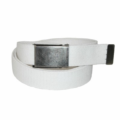 Classic cotton web belt with a military style buckle makes a great casual belt. The strap measures 1.25 inches wide and has an end tip that matches the nickel finish of the buckle. The buckle is clamp-on, allowing you to cut to shorten the belt. Simply pry off the buckle, cut off the extra fabric, and clamp the buckle back on. Adjustable to 60 inches long. All three belts will be in the same color. Made of Cotton