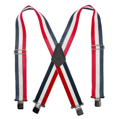 Y-back style with faux leather back patch; metal clip-ends and adjusters