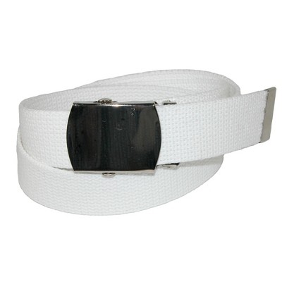 A quality fabric 1.25 inch belt. Fully adjustable up to 60 inches, you can always shorten it by prying off the buckle, using scissors to trim the length, and replace the buckle. The flip top buckle is antiqued brass and has a matching metal tip on the other end. Made of Cotton