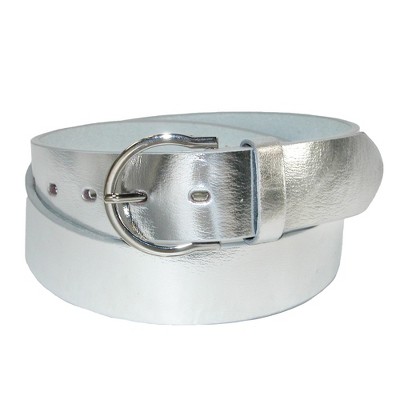 Timeless belt design with fashionable metallic colors. Its simplicity makes it versatile - add a splash of color to any outfit. Two loops and a polished silver tone buckle. Made of Leather