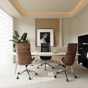 Upgrade your workspace with this sophisticated executive office chair that seamlessly blends modern design with exceptional comfort. Featuring a sleek combination of leather upholstery and a polished wood finish, this chair offers a luxurious aesthetic that enhances any professional setting. Engineered for both comfort and productivity, the ergonomically contoured high back supports your spine, while the padded seat and backrest provide lasting comfort during long workdays. Its height-adjustable mechanism and smooth swivel base with durable casters ensure effortless mobility and customization to your seating preference, making it perfect for any desk or office setup. Built with a sturdy metal frame and a five-star base, this chair promises stability and longevity. Whether you're working on a major project or hosting a meeting, this chair combines elegance with practicality, giving you the perfect balance of style and support.