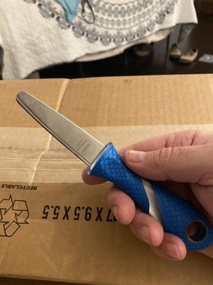 [This review was collected as part of a promotion.] the knife blade works great but the real star is the handle. as you know you can really hurt yourself with one of these knives if your not carful but the handle on this one has a very positive grip. no slip even when covered in clam juice!!!!