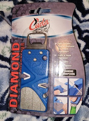 [This review was collected as part of a promotion.] The Cuda Pocket Sharpener is compact and handy. It has a fine ceramic and coarse diamond "V" notch sharpeners as well has hook sharpeners. There's also a line cutter and will connect to Cuda tool lanyards and fit easily in your pocket. The best feature is the bottle opener!