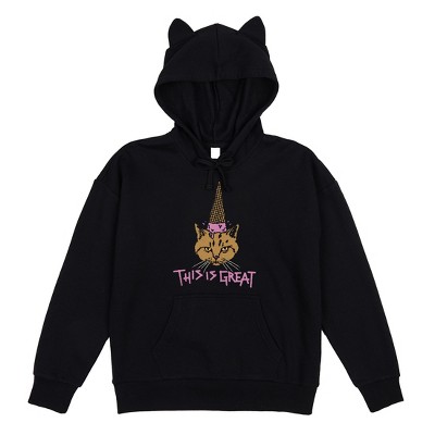 Unleash your feline fashion with this women's black long sleeve hooded sweatshirt. Featuring a cuddly kitten with a heart on the front and 3D ears on the hood, this hoodie brings a touch of playful charm to your outfit. Crafted with a soft cotton-polyester blend and equipped with an adjustable hood, this sweatshirt provides personalized comfort. Machine wash it on cold with like colors and tumble dry on low heat for easy care.