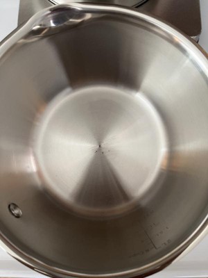 As pictured received it as promised. Used for the first however not sure why the sauce pan has the black spot in center of the pan. Doesn’t seem there’s any chips on it. I purchased because I wanted 2qt see through lid.