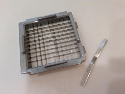 Purchased to chop a bunch of onions to be frozen. Used the small blade to chop one small onion cut in half and a blade bent making the small blade unusable. Did manage to cut 10 quart bags full with the large one before we called it good for the night. Will be returning it as I was excited for the small blade for making fresh pico quickly or taco nights. Instructions are very minimal and do not give much instruction on how to prepare the veggies for chopping. And to think it claims to be able to cut potatoes up to 4 inches long.