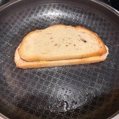 [This review was collected as part of a promotion.] It’s a solid pan. The grilled cheese we tried cooking on it came out with a good crust and crunchy texture. I will say it did make popping/cackling noises that sounded tin-like when it was used on our gas stovetop, which was a little concerning. It’s also a little iffy on if it takes high heat well. I would not spend this amount of money for one pan regularly though.