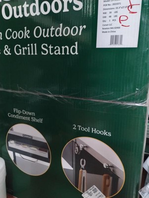 The Cuisinart Prep 'n Cook Outdoor Table & Grill Stand allows you to seamlessly move from food prep to cooking while using your portable grill. The Prep 'n Cook stainless steel table top measures 48" x 24". One half of the table will fit most portable grills, griddles, and pizza ovens. The other half offers a spacious area for food prepping and serving. The front of the table features a hide-away condiment caddy, giving you extra room to store all of your sauces and spices. To keep your work surface clean, the garbage bag holder allows you to easily dispose of foods scraps as you go. When you're finished cooking, wipe the surface clean for next time with the integrated paper towel holder. The prep half of the table folds down and the unit can be easily rolled away for storage.