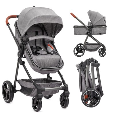 Highlights at a Glance:Easily converts from bassinet to toddler seat.Smooth ride on all surfaces with EVA wheels and shock absorption.Adjustable canopy for UV protection and three reclining positions.Lightweight aluminum frame with one-click folding for portability.5-point safety harness and spacious storage basket for convenience.